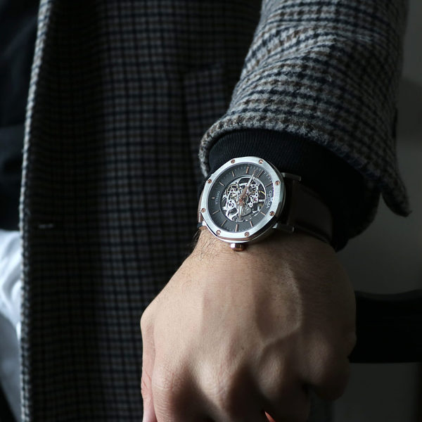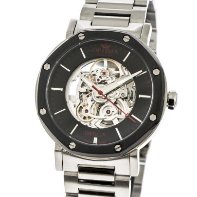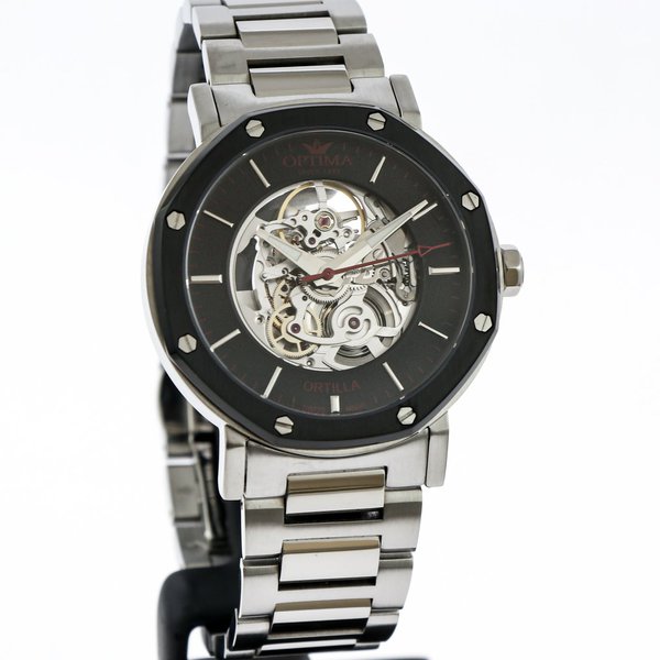 Silberfarbene Zeiger mit Leuchtmasse, silberfarbene Indexe. Rundes Zifferblatt.